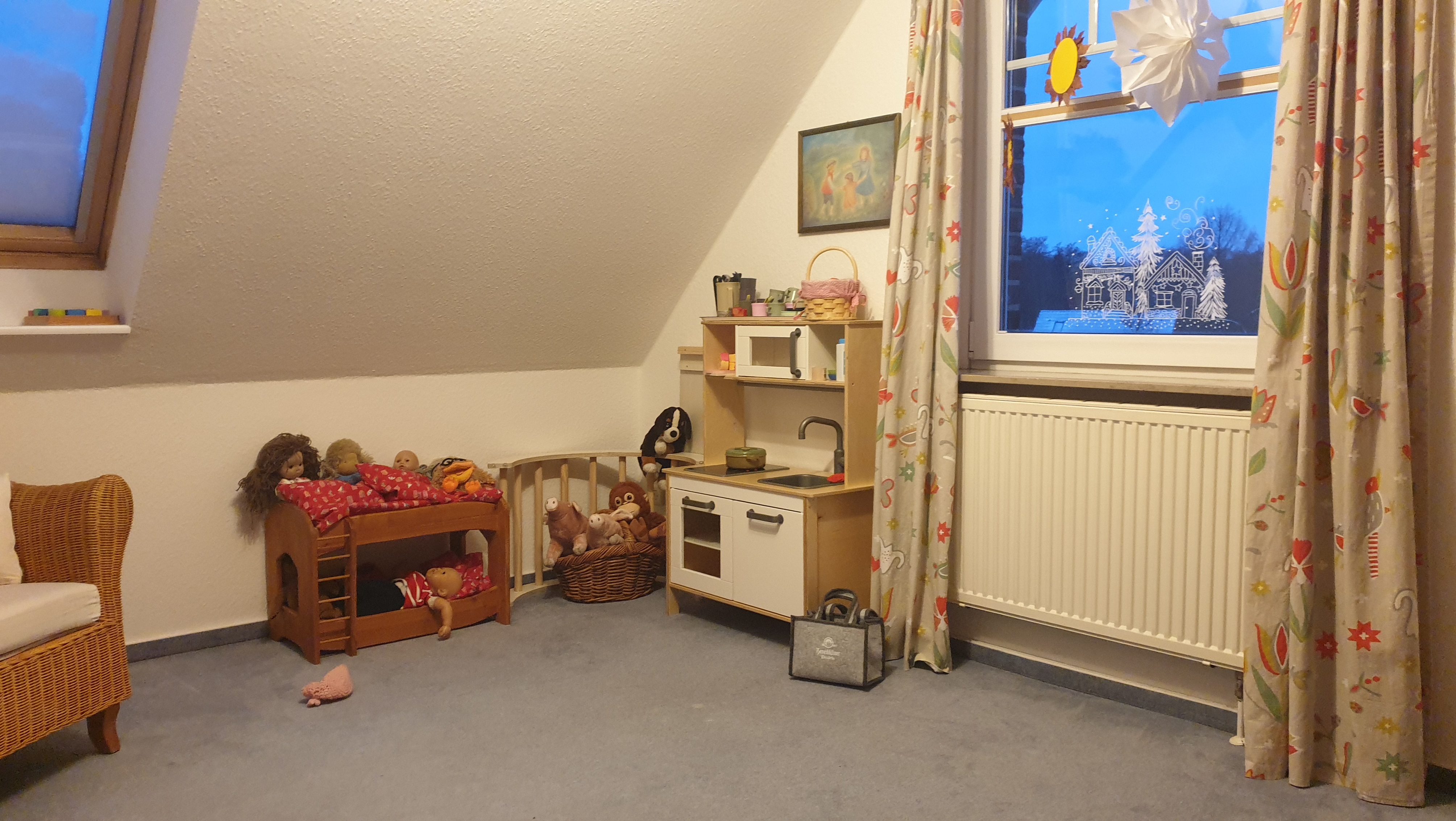 Die hellen Räume im Obergeschoss bieten den Kindern viel Platz zum Spielen, Basteln, Toben und allem, was großen Spaß macht. Damit wir möglichst viel Platz haben sind die Matratzen für den Mittagsschlaf auf einem Hems gelagert und werden dann vor dem Mittagsschlaf für jedes Kind heruntergeholt und zu einem gemütlichen Bettchen gebaut. Je nach Vorliebe schlafen die Kinder unter einer Decke, oder in einem Schlafsack.
